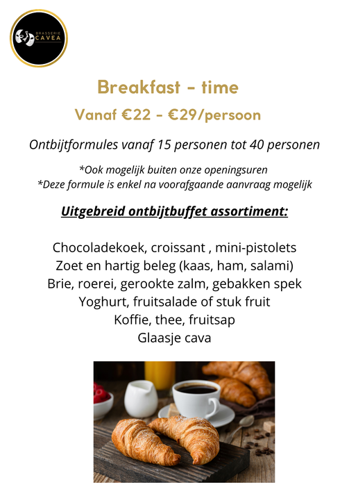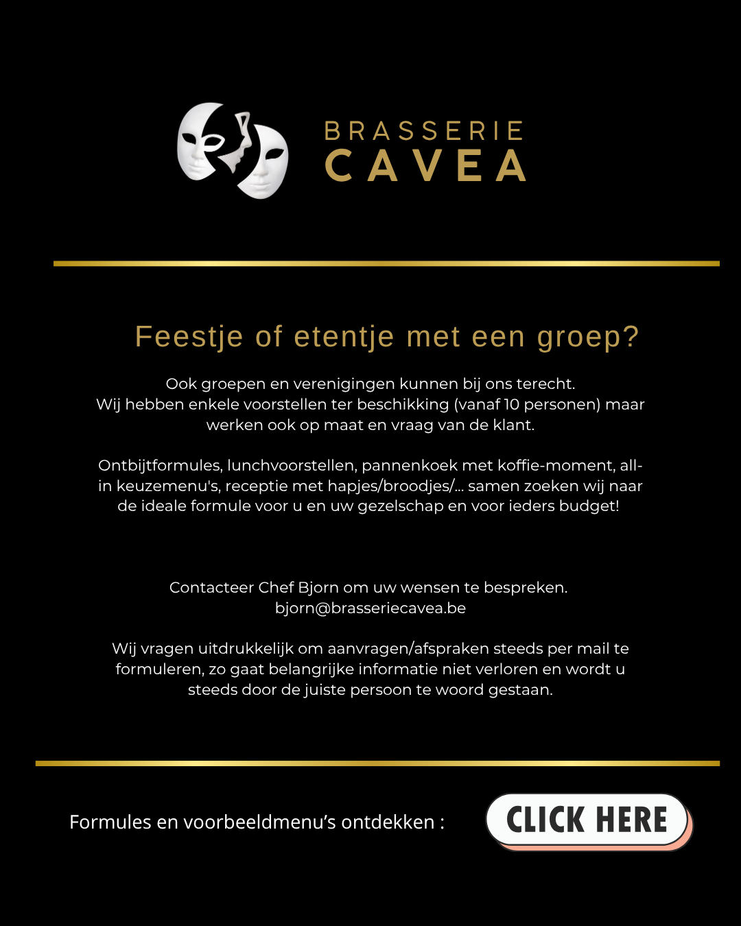 Ontbijtformules, lunchvoorstellen, pannekoek met koffie-moment, all-in keuzemenu's, receptie met hapjes/broodjes/... samen zoeken wij naar de ideale formule voor u en uw gezelschap en voor ieders budget!